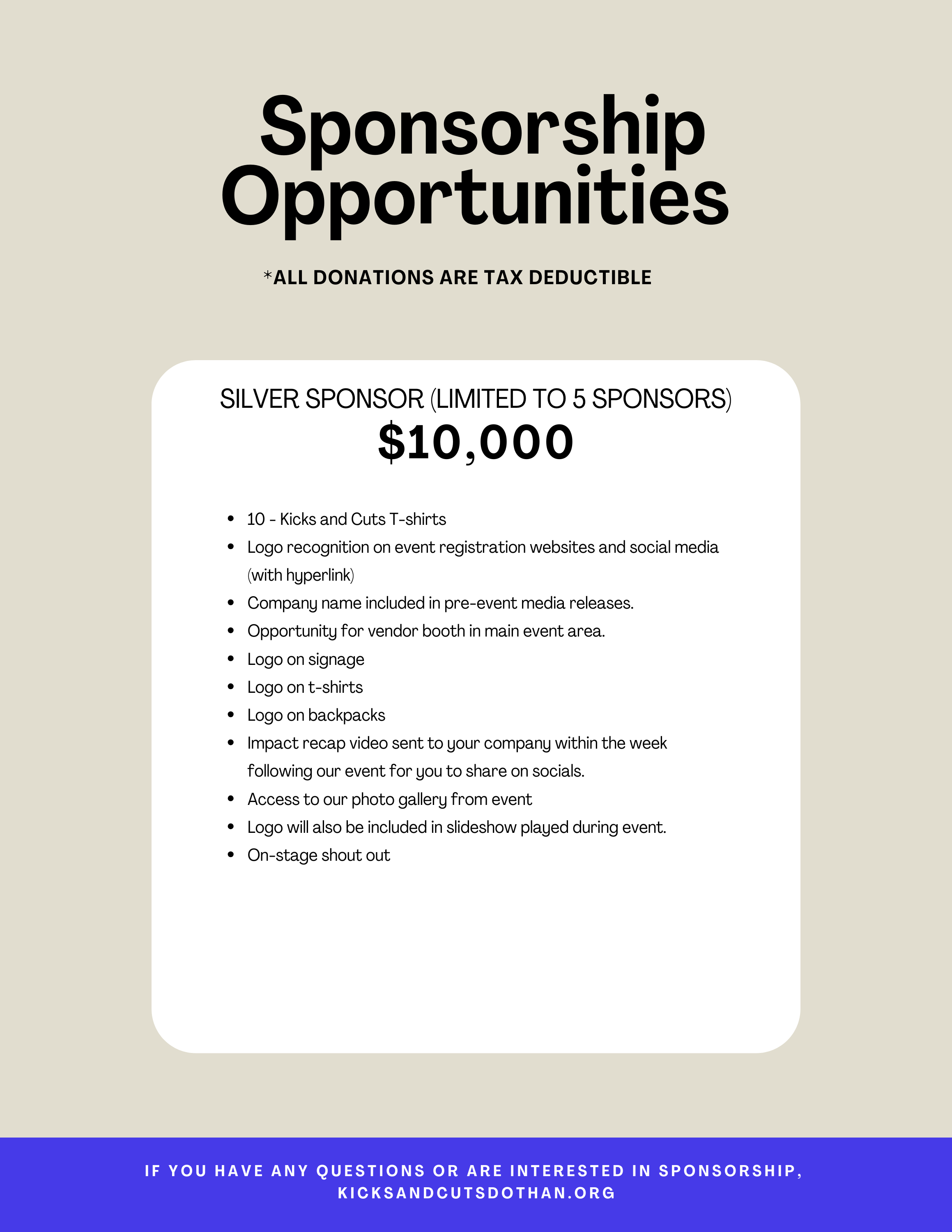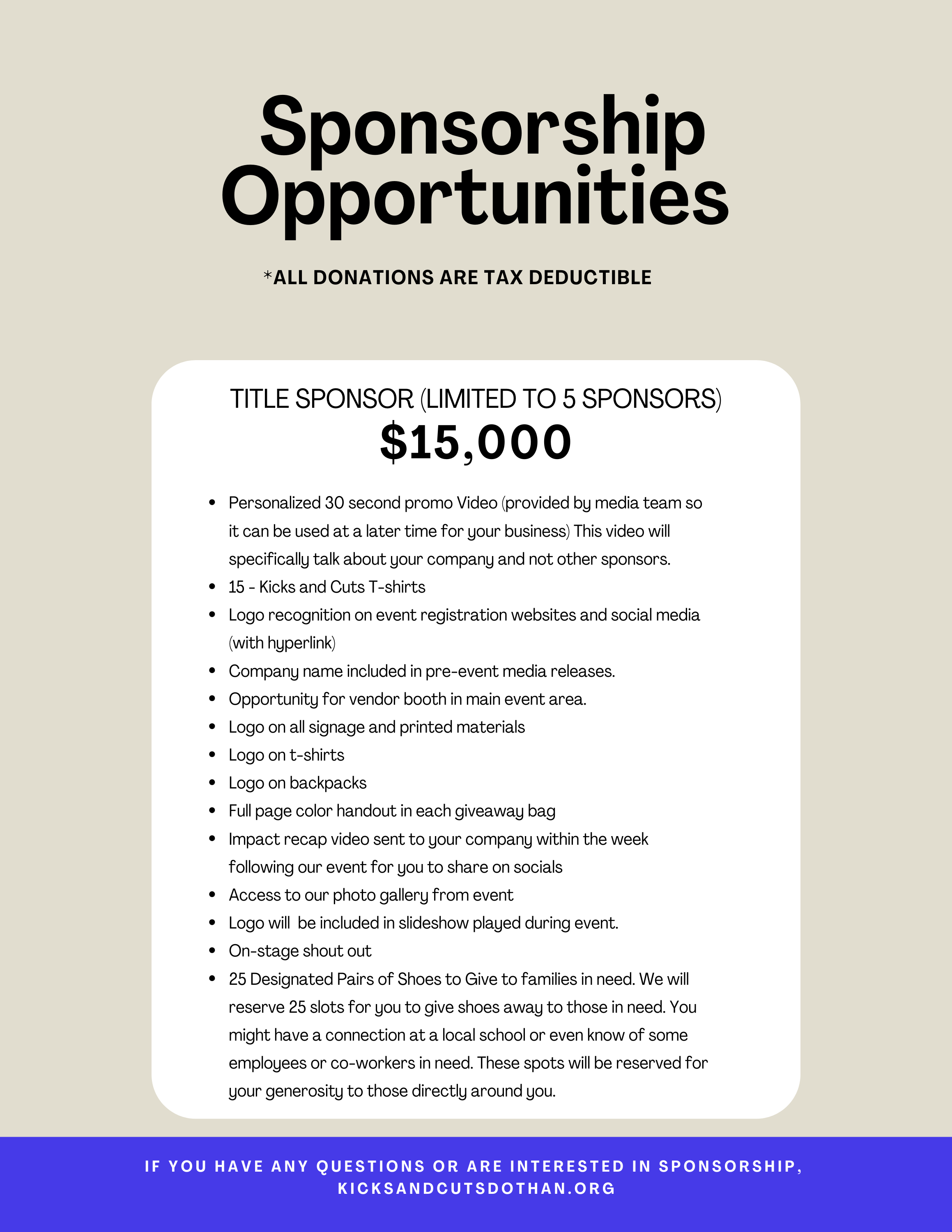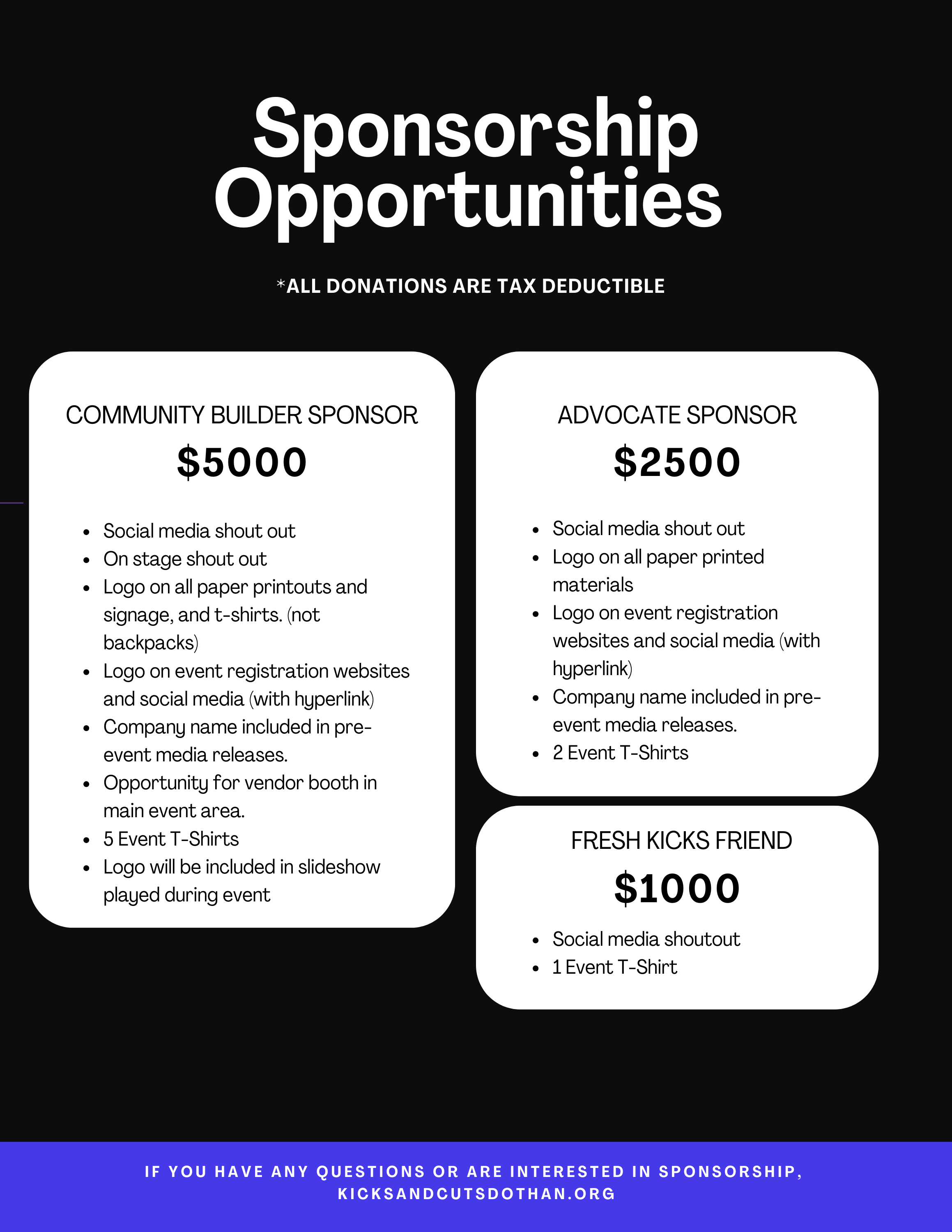 If you would like to be a Sponsor for Kicks and Cuts you can donate using the link below or by check payable to Church at the Crossing - 1369 Headland Avenue, Dothan, AL 36303.